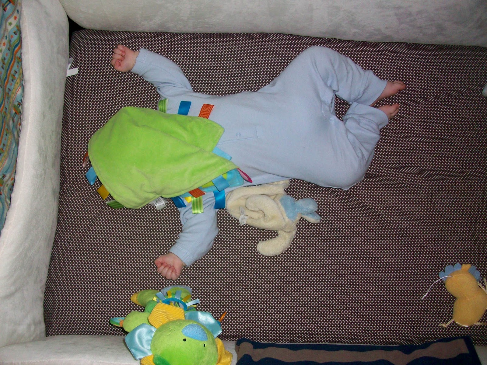 Saturday, we got a laugh out of Sam while he napped. He has a few "Lovies" - his Pup Pup, Mr. Monks, and his tag blanket. Well, when he sleeps, Pup Pup and the tag blanket often end up on his face like below.